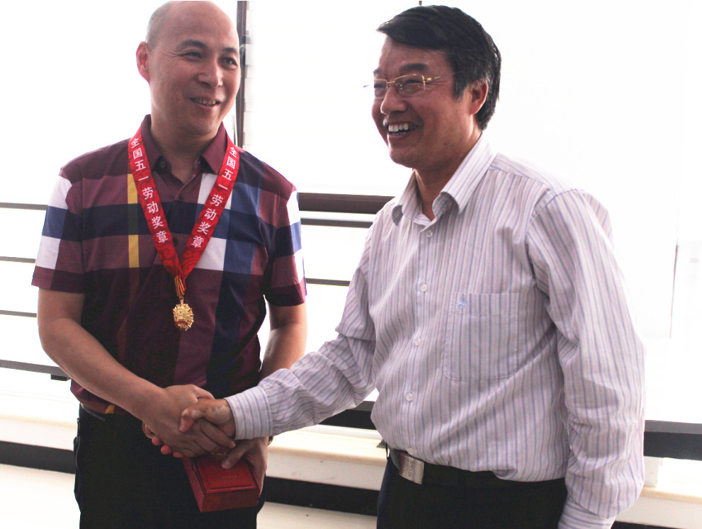 會議現場市總工會常務副主席梁立昌為張宏偉授獎5月8日下午,咸陽市總工會常務副主席梁立昌一行三人專程來到咸陽銀河公司,親切看望了全國五一勞動獎章獲得者張宏偉同志,代表市